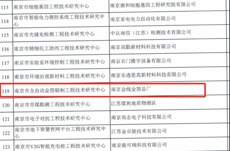 近日,南京市科学技术局公布了2024年度南京市工程技术研究中心认定名单(宁科通【2024】47号),南京金线金箔总厂申报的“南京市全自动金箔锻制工程技术研究中心”成功获批。