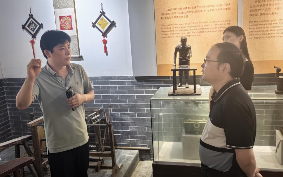 会后,在杨文的带领下,各位领导参观了南京金箔锻制技艺展示馆。在展示馆内,杨文详细介绍了金箔锻制的历史沿革、工艺流程和文化内涵。领导们对这一传统工艺的精湛技艺表示赞赏,纷纷驻足观看展柜中各种规格的金箔及文创产品,了解其在不同领域的广泛应用。