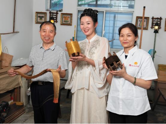 最后一站,焦绿儿来到真金线制作区,与代表性传承人王清、王敬同框合影。三人手中捧着真金线制作的核心工具,焦绿儿捧着金灿灿的线轴,笑容里满是惊喜。 王清老师展示着刚制成的真金线 —— 纤细却闪着柔光。要知道,真金线需将黄金锤成金箔,粘在纸张上切成细条,再搓捻成线,每一步都考验耐心与技艺。王敬老师现场演示 “搓金线”“揹金”,动作娴熟流畅,仿佛在跳一场古老的匠艺舞蹈。 亲手体验后,焦绿儿不禁感叹:“原来一根小小的金线,要经过这么多工序!老匠人们把一辈子耗在这上面,太了不起了。” 这一幕,正是非遗传承的温暖瞬间:老匠人把技艺传给新一代,达人把故事带给千万网友,让 “真金线” 的光芒,照进更多人的心里。
