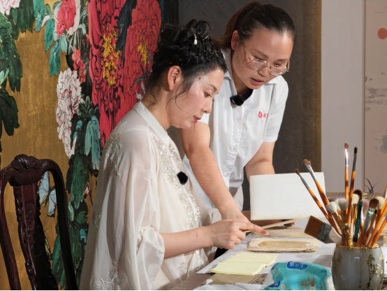 转到另一间工作室,背景是一幅绚烂的金箔牡丹壁画,焦绿儿正跟着切箔师傅学手艺。要知道,南京金箔最薄能达 0.1微米(比头发丝还细),切箔时稍一用力就会破损。师傅手把手指导:“手腕要稳,下刀要轻,角度得精准……” 焦绿儿屏住呼吸、小心翼翼操作工具,原本觉得 “看似简单” 的动作,真正上手才懂有多难。那薄如蝉翼的金箔,在匠人手中是 “玩于股掌” 的艺术品,背后是无数次练习的肌肉记忆。这一刻,“匠心” 不再是抽象的词汇,而是指尖传来的力度、眼神里的专注,是非遗技艺 “慢工出细活” 的最直观体现。