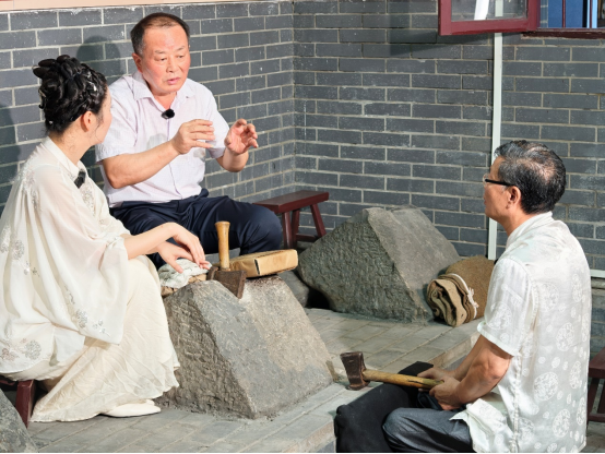 灰砖墙、老工具、墙上悬挂的荣誉证书…… 在充满岁月质感的工作室里,焦绿儿与金箔技艺大师王必生、葛义根围坐交流。王必生老师抬手演示捶打技艺的瞬间,仿佛将时光拉回数百年前 —— 金箔制作需经 “倒条、下条、拍叶、做捻子” 等十多道工序,每一步都离不开匠人几十年沉淀的手感与匠心。 “现在年轻人还愿意学吗?”“如何让老技艺在今天‘活’下去?” 焦绿儿的提问,直戳非遗传承的核心。大师们笑着分享:如今既有老匠人坚守传统,也有年轻力量以创新为金箔 “破圈”(比如将金箔融入文创、时装),让千年技艺既能 “守根”,也能拥抱时代。这场对话,让非遗从 “博物馆里的老古董”,变成了鲜活的、与时代共振的文化生命。