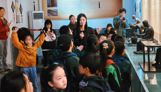 当讲到金箔文创产品时,展柜里的金箔书签、金箔装饰画、金箔文创摆件吸引了学生们的目光。“这些文创产品,是把传统金箔技艺和现代审美结合起来,让老技艺有了新活力。”陈月拿起一枚金箔书签介绍道。“那以后会有更多有意思的文创吗?比如结合我们课本里的知识?”学生们纷纷提问,思维的火花在交流中碰撞,也让大家意识到:非遗不是“老古董”,而是能与现代生活相融的鲜活文化。