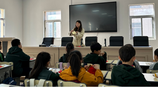 随后,学生们分组围坐,每人领到一套简易贴金工具和小摆件,开始亲身体验。“老师,我贴的金箔有气泡怎么办?”“这里歪了,能调整吗?”面对学生们的疑问,孔思思一一耐心解答,手把手教他们调整角度、按压手法。初二学生陈诺专注地盯着手中的摆件,小心翼翼地将金箔贴上去,当最后一片金箔贴好,她兴奋地举起作品:“看!我贴的!虽然不完美,但特别有意义!”看着学生们脸上的笑容,孔思思欣慰地说:“能让孩子们亲手接触贴金技艺,感受到它的魅力,就是最好的传承。”