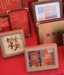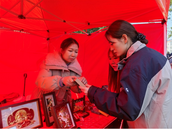 其中,最受居民青睐的当属金箔文创展示区,这里成为传承千年金箔非遗、连接传统与现代的重要载体。非遗传承人陈月、孔思思耐心向居民介绍金箔文创产品:精致的金箔书签印着新春纹样,小巧的金箔福字挂件闪着细腻光泽,每一件都融合了传统金箔工艺与现代设计巧思。“这金箔福挂在家里,既有年味又有文化感!” 市民游客拿起挂件细细端详,连连称赞。两位传承人还现场讲解金箔制作小知识,让大家在赏玩间感受非遗魅力,也让“文化年货” 多了份独特的匠心温度。